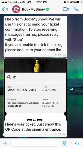 BookMyShow ticket received via WhatsApp
